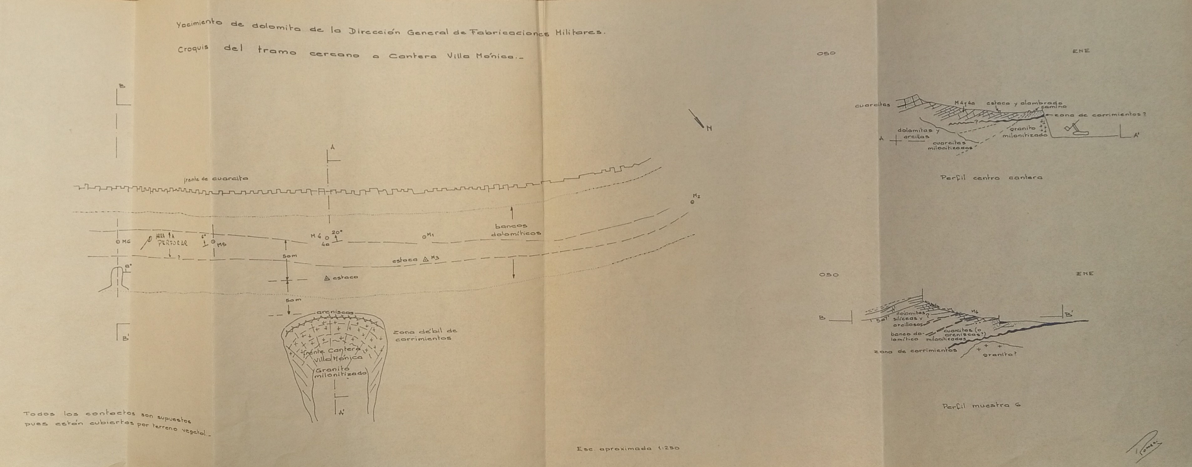 Informe realizado entre el 18 y 21 de octubre de 1965, mediante un asesoramiento del cursante a la firma "Cantera Villa Mónica", interesada en la explotación del yacimiento de dolomita perteneciente a la DGFM. La firma nombrada se dedica a la explotación de una cantera de granito cuyo frente en el momento de la visita se hallaba solo a unos 50 metros del alambrado que limita la pocesión de la DGFM. El informe registra una serie de trabajos de destape en busca de los bancos dolomíticos, sin éxito. El interés de la empresa del rubro era explotar en un sector lo más cercano posible a su cantera para evitar desplazamientos de la maquinaria pesada. El informe incluye un croquis del tramo cercano a la cantera Villa Mónica, donde se encuentra ubicado el yacimiento de dolomita de la DGFM.