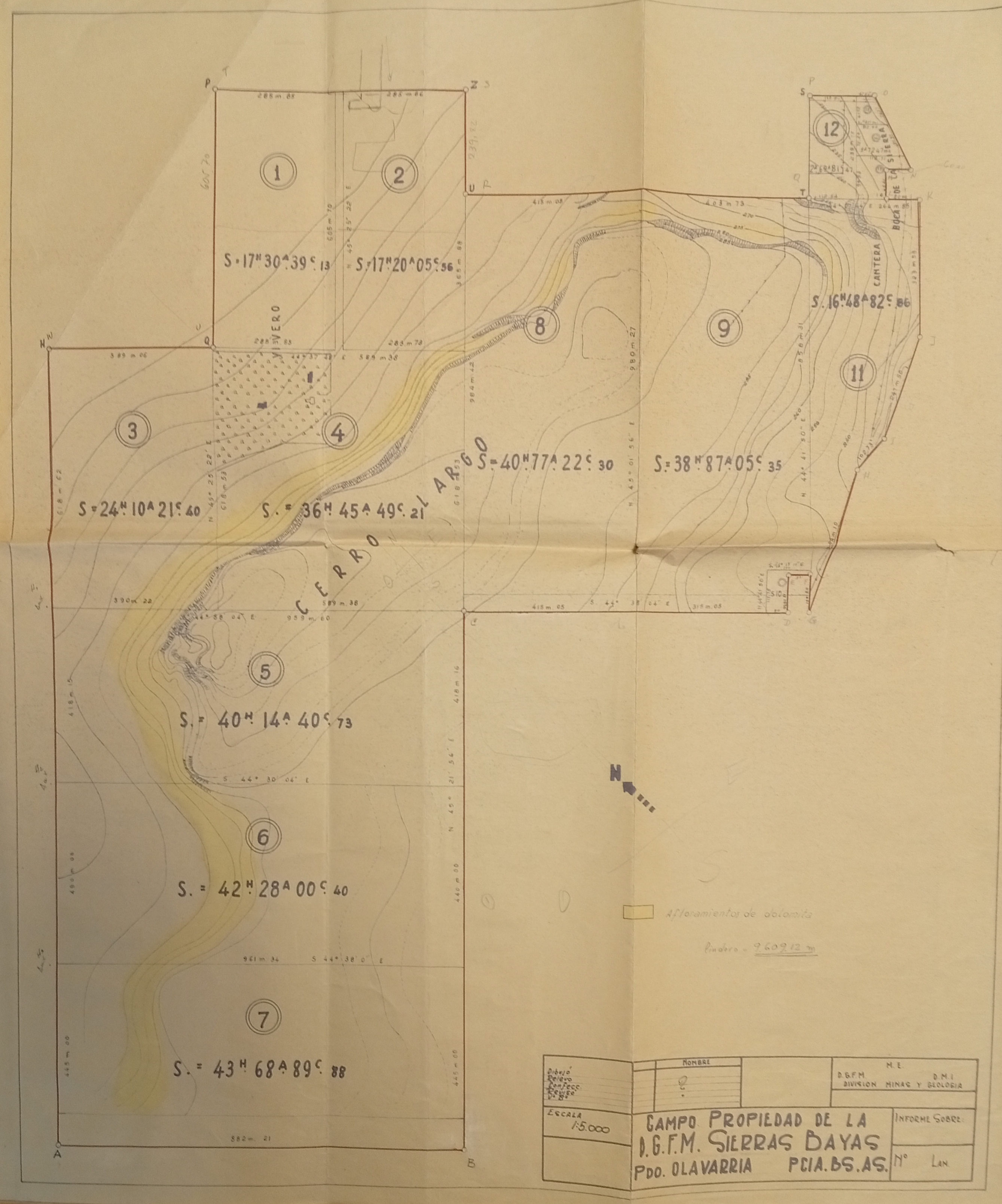 Informe realizado sobre el campo de propiedad de la DGFM, situado en la Sierra Baja, a 18 kilómetros al este de la ciudad de Olavarría, sobre la existencia de dolomita explotable en cantidades considerables. El texto establece la posición del departamento de la DGFM frente a la solicitud planteada por los señores Alfredo Zúcaro y Cruz Antonio Pavone. El documento incluye plano del campo de propiedad de la DGFM en Sierras Bayas.