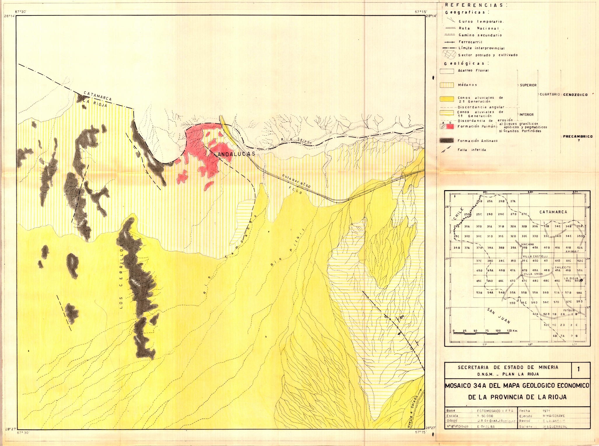 Argentina. Dirección Nacional de Geología y Minería. Plan Cordillera Norte. 1972. Descripción del mosaico 34A del mapa geológico económico de la Provincia de La Rioja. 27 pp. La Rioja, Secretaría de Estado de Geología y Minería. Plan Cordillera Norte