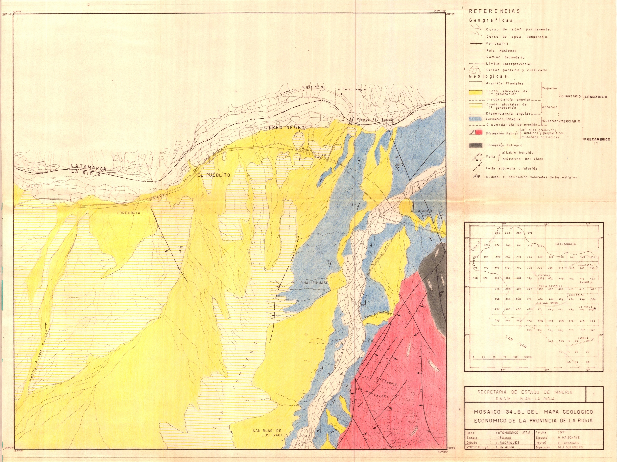 Argentina. Dirección Nacional de Geología y Minería. Plan Cordillera Norte. 1972. Descripción del mosaico 34A del mapa geológico económico de la Provincia de La Rioja. 30 pp. La Rioja, Secretaría de Estado de Geología y Minería. Plan Cordillera Norte