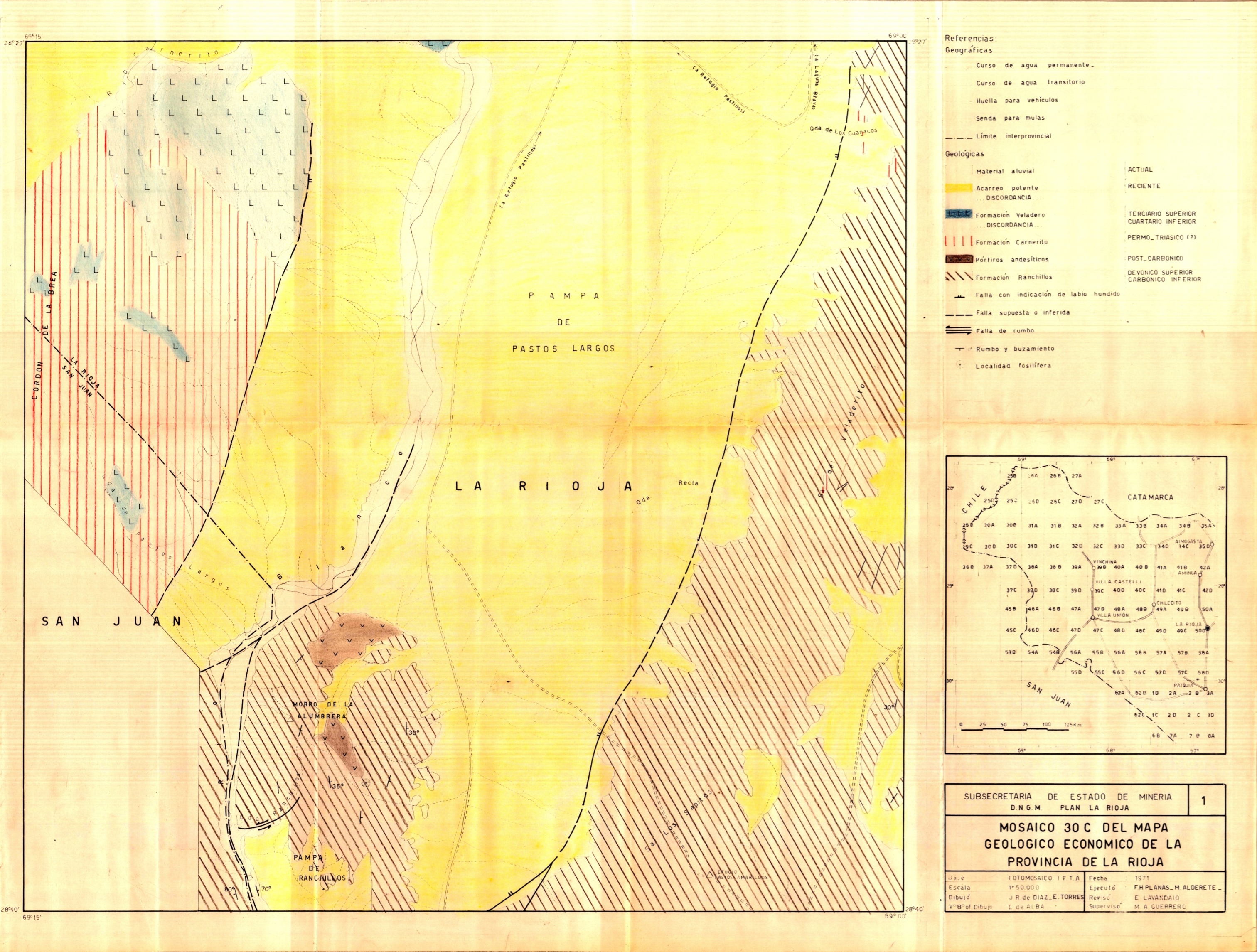 Argentina. Dirección Nacional de Geología y Minería. Plan Cordillera Norte. 1970. Descripción de los Mosaicos 30C del mapa geológico económico de la provincia de La Rioja. 37 pp. La Rioja, Secretaría de Estado de Geología y Minería. Plan Cordillera Norte